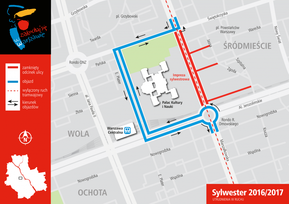 – wyłączenie z ruchu ul. Sienkiewicza, od ul. Marszałkowskiej do ul. Zgoda w terminie 31 grudnia od godz. 15.00 do 1 stycznia 2017 r. do godz. 6.00.