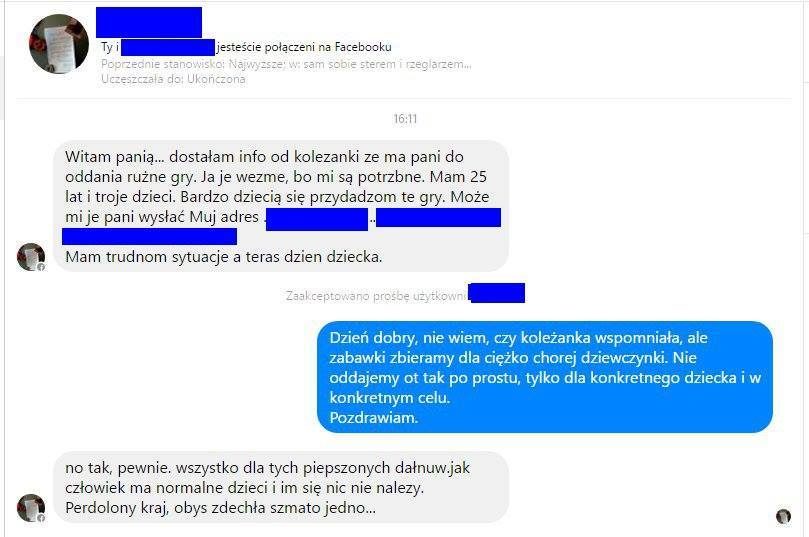 Pani Ewa mogła się przekonać, że bezczelność i postawa roszczeniowa niektórych są odwrotnie proporcjonalne do ich kultury. Po informacji, że zabawki zostały doręczone, jedna z wolontariuszek dostała wiadomość od pewnej matki. Odpowiedź wolontariuszki była miła, ale konkretna, czego nie można już powiedzieć o wiadomości zwrotnej. Zdjęcie tej konwersacji zostało zamieszczone powyżej.