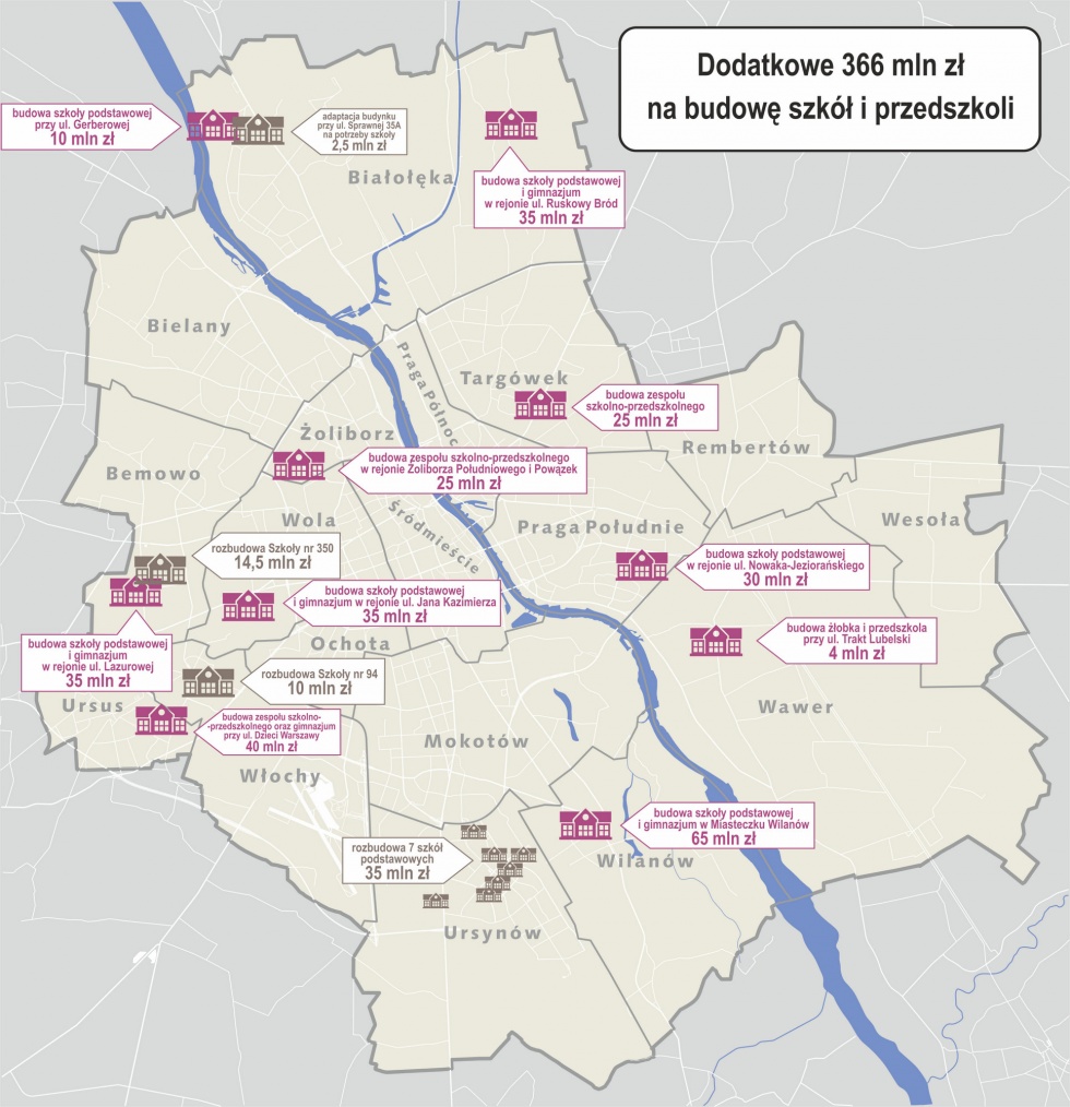 Decyzją Hanny Gronkiewicz – Waltz, Prezydent m.st. Warszawy w najbliższych latach dodatkowo zostanie przeznaczone 366 mln zł na budowę i rozbudowę szkół oraz przedszkoli w stolicy.
