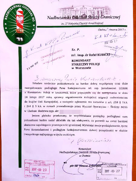 Podziękowanie dla mł. asp. Jarosława Lesiaka przesłane przez Zastępcę Komendanta Nadbużańskiego Oddziału Straży Granicznej płk Tomasza Zybińskiego na ręce Komendanta Stołecznego Policji mł. insp. Rafała Kubickiego świadczą o profesjonalizmie funkcjonariusza, dzięki któremu możliwe było zatrzymanie i postawienie zarzutów 45-letniemu obywatelowi Wietnamu.