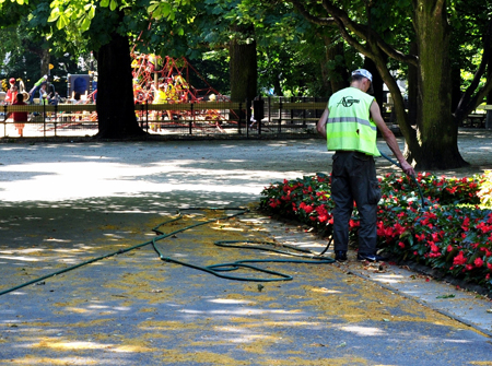 Podlewanie kwiatów w Ogrodzie Saskim. Fot. ZOM