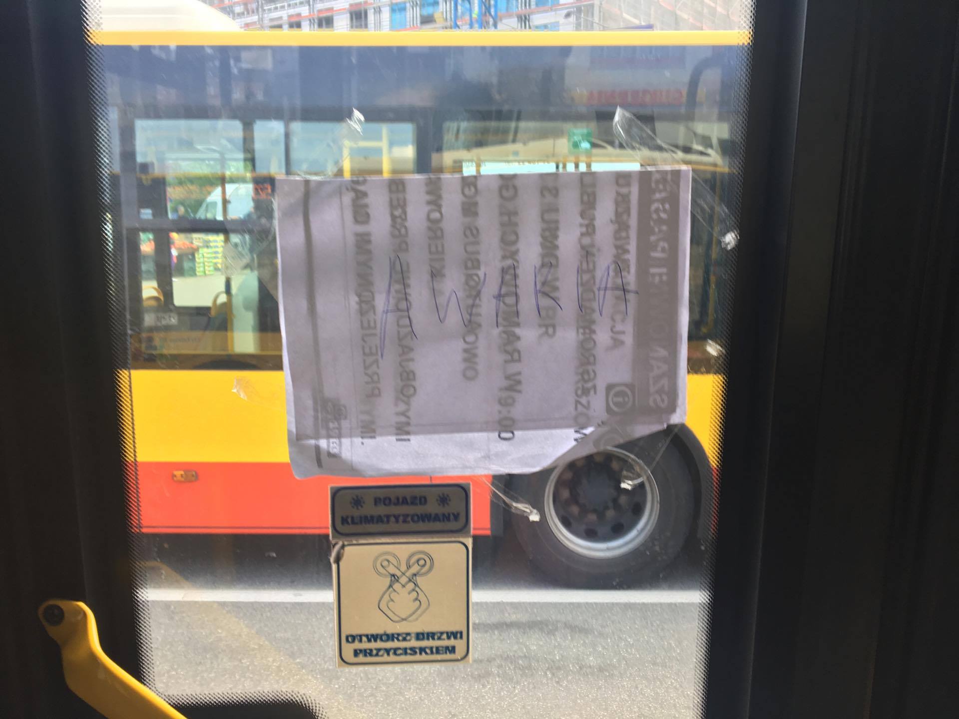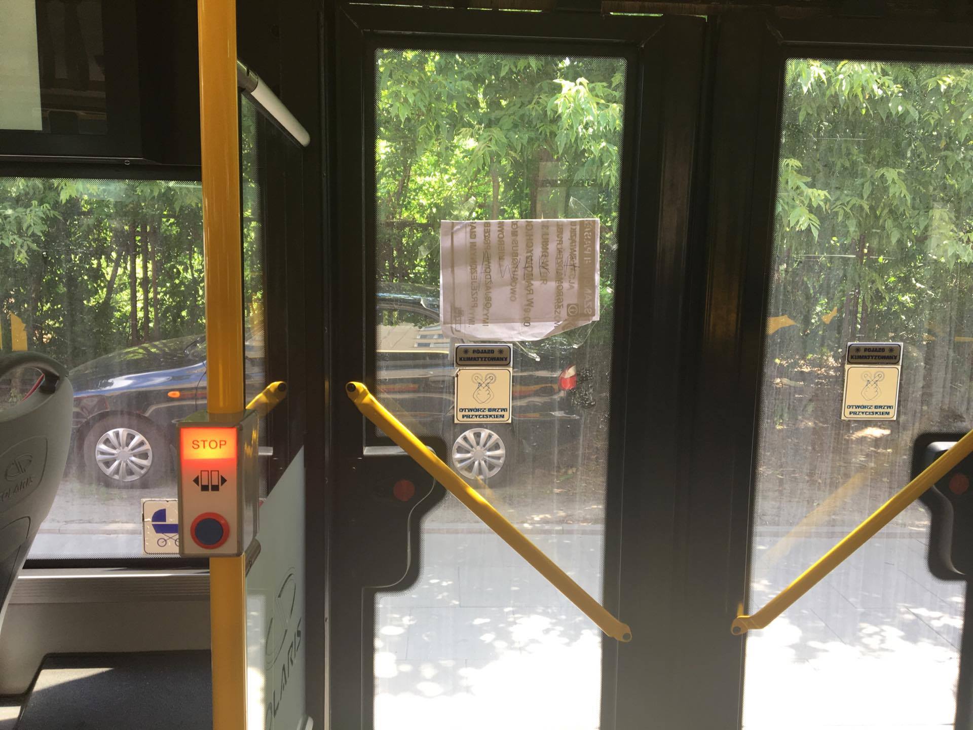 „W autobusie 523 o nr bocznym A750 nie działają tylne drzwi w związku z czym powieszono kartkę „awaria”. Dodatkowo nie działa klimatyzacja, a na zewnątrz jest obecnie 28 stopni w cieniu. Załączam zdjęcia. Z góry dziękuję za odpowiedź.” – brzmiał mail