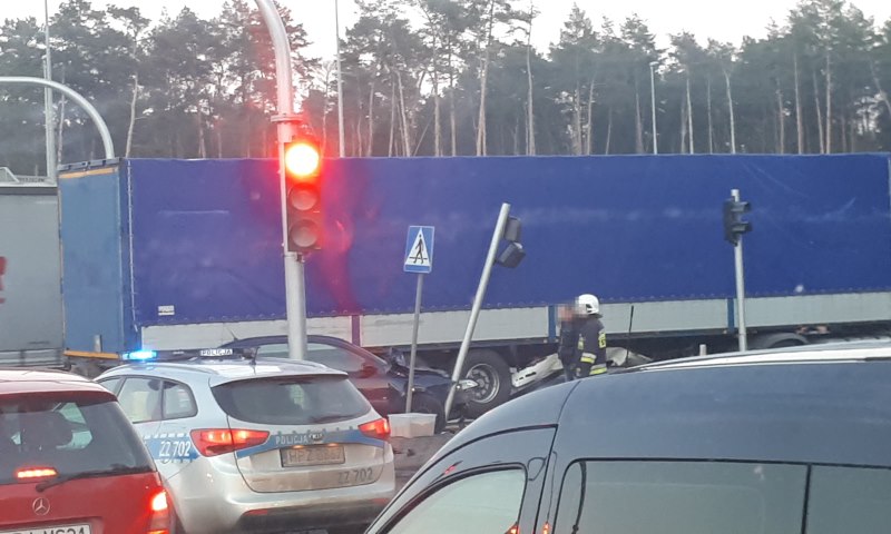 Na skrzyżowaniu krajowej „siódemki” z Drogą Wojewódzką nr 721 ciężarowy mercedes zderzył się z samochodem osobowym marki opel.