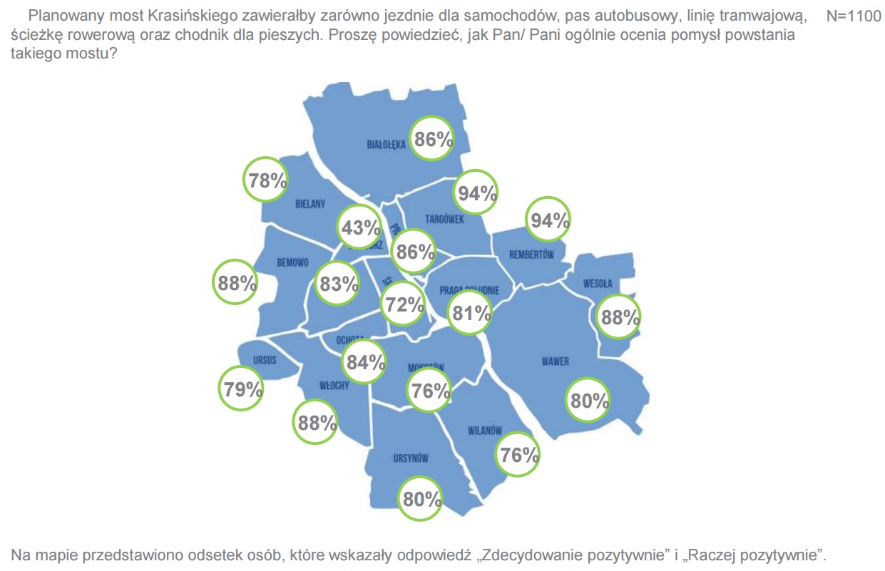 Pozytywnie na temat budowy mostu z jezdnią dla samochodów, buspasem dla autobusów, linią tramwajową, ścieżką rowerową i chodnikiem dla pieszych wypowiedziało się 80 proc. warszawiaków. Za takim rozwiązaniem byli głównie mieszkańcy północno-wschodnich dzielnic (89 proc. pozytywnych wskazań). W mniejszym stopniu projekt ten poparli mieszkańcy dzielnic północno-zachodnich (76 proc. pozytywnych wskazań).