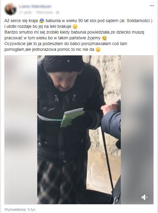 W sieci pojawiło się nagranie ze starszą Panią, która stoi pod sądami na Solidarności i rozdaje ulotki. Jak pisze autorka nagrania Pani zbiera na leki, a zapytana o przyczynę miała powiedzieć: „Dziecko muszę pracować w tym wieku bo w takim państwie żyjemy”.