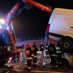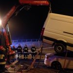 Strażacy użyli specjalnego podnośnika i ściągnęli busa z renault.
