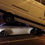 W wyniku zdarzenia bus zawisł na renault tuż za audi.