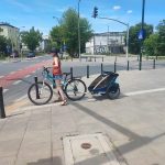 Młoda rowerzystka z dzieckiem w roli pasażera przejechała przez przejście dla pieszych. Wprawdzie kontynuowała jazdę ścieżką, która przebiegała obok, ale nie zeszła z roweru.