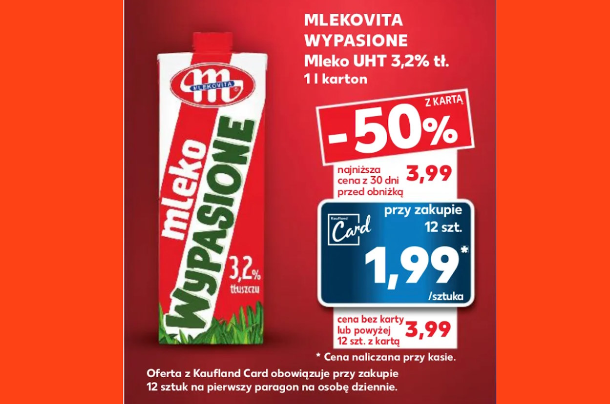 W nadchodzącą sobotę, 25 listopada, Kaufland przygotował dla swoich klientów atrakcyjną promocję na mleko wypasione marki Mlekovita UHT o zawartości tłuszczu 3,2%. Jest to doskonała okazja dla miłośników wysokiej jakości produktów mlecznych, aby zaopatrzyć się w niezbędne zapasy w bardzo korzystnej cenie.