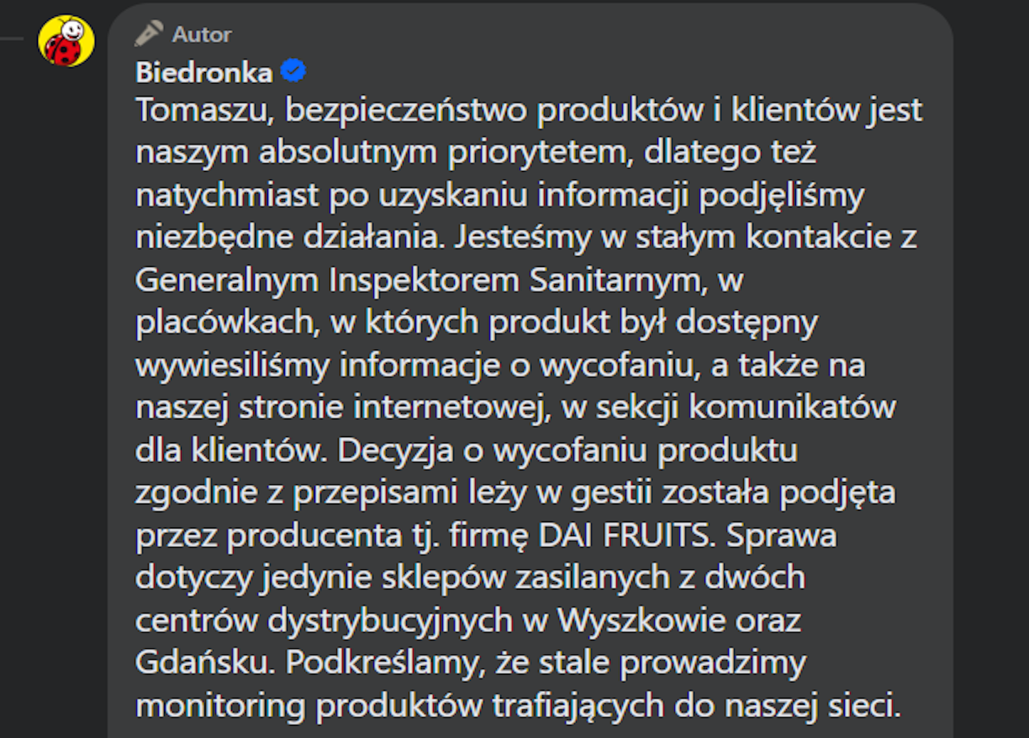 Produkt znajdował się w obrocie na terenie Polski za pośrednictwem dwóch głównych dystrybutorów: Jeronimo Martins Polska S.A. oraz REDENBERG Sp. z o.o., i to prawdopodobnie w dniach 11-12 marca 2024 r. Spożycie truskawek zanieczyszczonych wirusem WZW typu A może stanowić poważne ryzyko dla zdrowia, dlatego konsumenci, którzy zakupili wspomniany produkt, powinni zaprzestać jego spożywania i postępować zgodnie z wytycznymi organów urzędowej kontroli żywności.