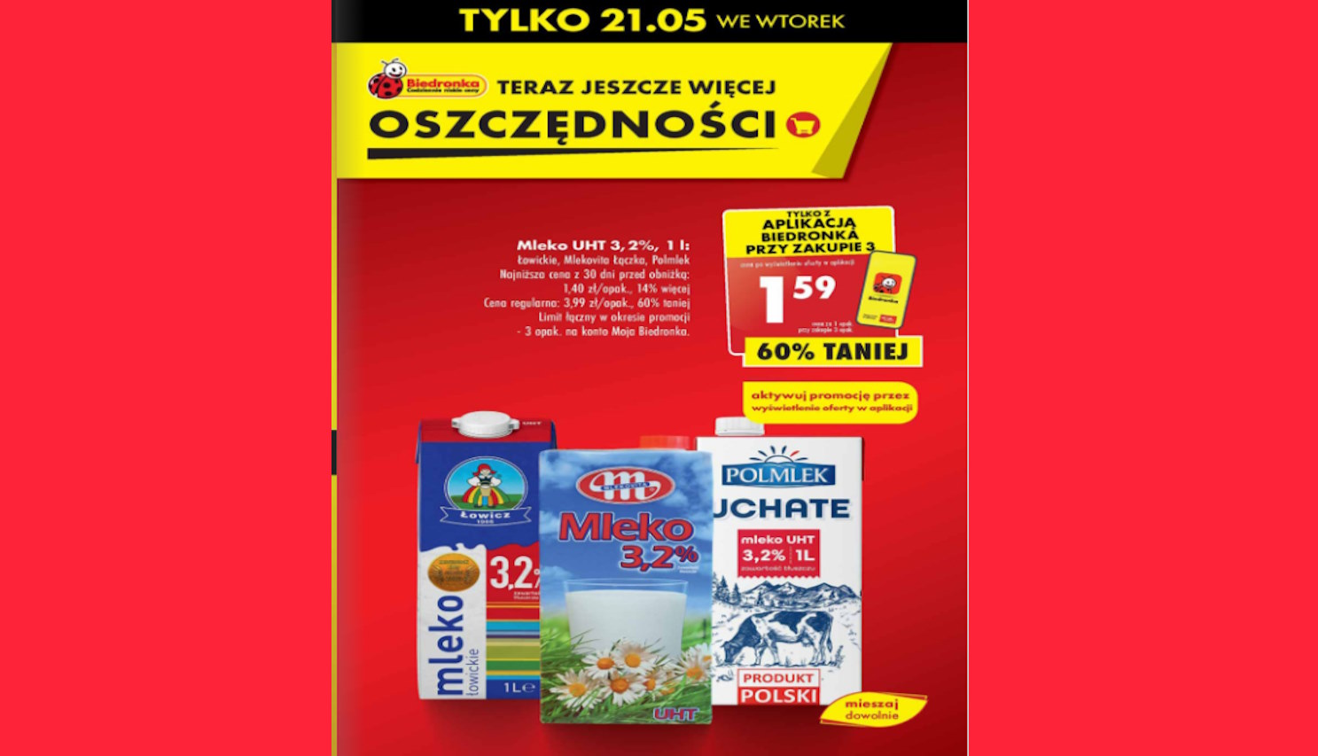 Już we wtorek, 21 maja, w Biedronce rozpoczyna się wyjątkowa promocja, która z pewnością przyciągnie rzesze klientów. Tego dnia mleko UHT 3,2% w kartonach 1 litra, dostępne w różnych markach jak Łowicz, Mlekovita i Polmlek, będzie można kupić w rewelacyjnej cenie dzięki promocji 60% taniej.
