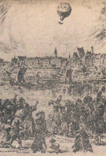 Wzlot balonu Okraszewskiego z tarasu Zamku Królewskiego w Warszawie w rycinie M. Kościelniaka. (Źródło: Konieczny J. R. ”Na skrzydłach jak ptaki”. Krajowa Agencja Wydawnicza RSW Prasa- Książka- Ruch. Warszawa 1976).