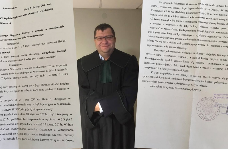 W liście gończym przeczytać można, że sąd wymierzył Zbigniewowi Stonodze karę jednego roku pozbawienia wolności i wezwał go do stawienia się w zakładzie karnym celem odbycia kary. W tym czasie obrońca biznesmena złożył dwa wnioski. Pierwszy dotyczył odroczenia kary, drugi aresztu domowego z systemem dozoru elektronicznego. Sąd odrzucił pierwszy wniosek, a drugi pozostawił bez rozpoznania odrzucając jednocześnie prośbę skazanego, by wstrzymać karę do czasu jego rozstrzygnięcia.