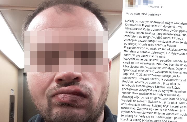 „Dzisiaj po nocnym seansie kinowym wracałem Krakowskim Przedmieściem do domu. Przy Ministerstwie Kultury zobaczyłem dwóch pijanych facetów, jeden sikał na mury ministerstwa, zanim zdarzyłem do niego podejść zaczął z kolegą zaczepiać przechodzące nastolatki. Jako że stojąca po drugiej stronie ulicy ochrona Pałacu Prezydenckiego udawała że nie widzi zdarzenia stanąłem w obronie dziewczyn. Od dziewczyn się odczepili ale zaczęli iść za mną.