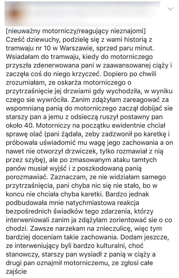 „nieuważny motorniczy/reagujący nieznajomi] Cześć dziewuchy, podzielę się z wami historią z tramwaju nr 10 w Warszawie, sprzed paru minut. Wsiadałam do tramwaju, kiedy do motorniczego przyszła zdenerwowana pani w zaawansowanej ciąży i zaczęła coś do niego krzyczeć. Dopiero po chwili zrozumiałam, ze oskarża motorniczego o przytrzaśnięcie jej drzwiami gdy wychodziła, w wyniku czego sie wywróciła. Zanim zdążyłam zareagować za wspomnianą panią do motorniczego zaczął dobijać sie starszy pan a jemu z odsieczą ruszył postawny pan około 40. Motorniczy na początku ewidentnie chciał sprawę olać (pani żądała, zeby zadzwonił po karetkę i próbowała uświadomić mu wagę jego zachowania a on nawet nie otworzył drzwiczek, tylko rozmawiał z nią przez szybę), ale po zmasowanym ataku tamtych panów musiał wyjść i z poszkodowaną panią porozmawiać. Zaznaczam, ze nie widziałam samego przytrzaśnięcia, pani chyba nic się nie stało, bo w koncu nie chciała chyba karetki. Bardzo jednak podbudowała mnie natychmiastowa reakcja bezpośrednich świadków tego zdarzenia, którzy interweniowali zanim ja zdążyłam zorientować sie o co chodzi. Zawsze narzekam na znieczulicę, więc tym bardziej doceniam takie zachowania. Dodam jeszcze, ze interweniujący byli bardzo kulturalni, choć stanowczy, starszy pan wysiadł z panią w ciąży a drugi pan oznajmił motorniczemu, ze zgłosi całe zajście”.