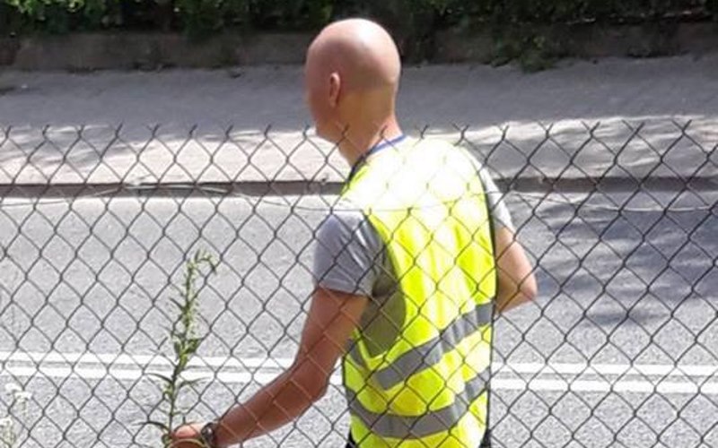 „Ubrany w odblaskową kamizelkę, szary t-shirt. jasne jeansy i czarne buty sportowe. Całkiem łysy, szczupły.ok 175cm wzrostu. Czarna skórzana teczka w ręku i zawieszony na smyczy identyfikator ale nie wiem z jakiej firmy.