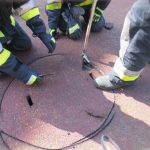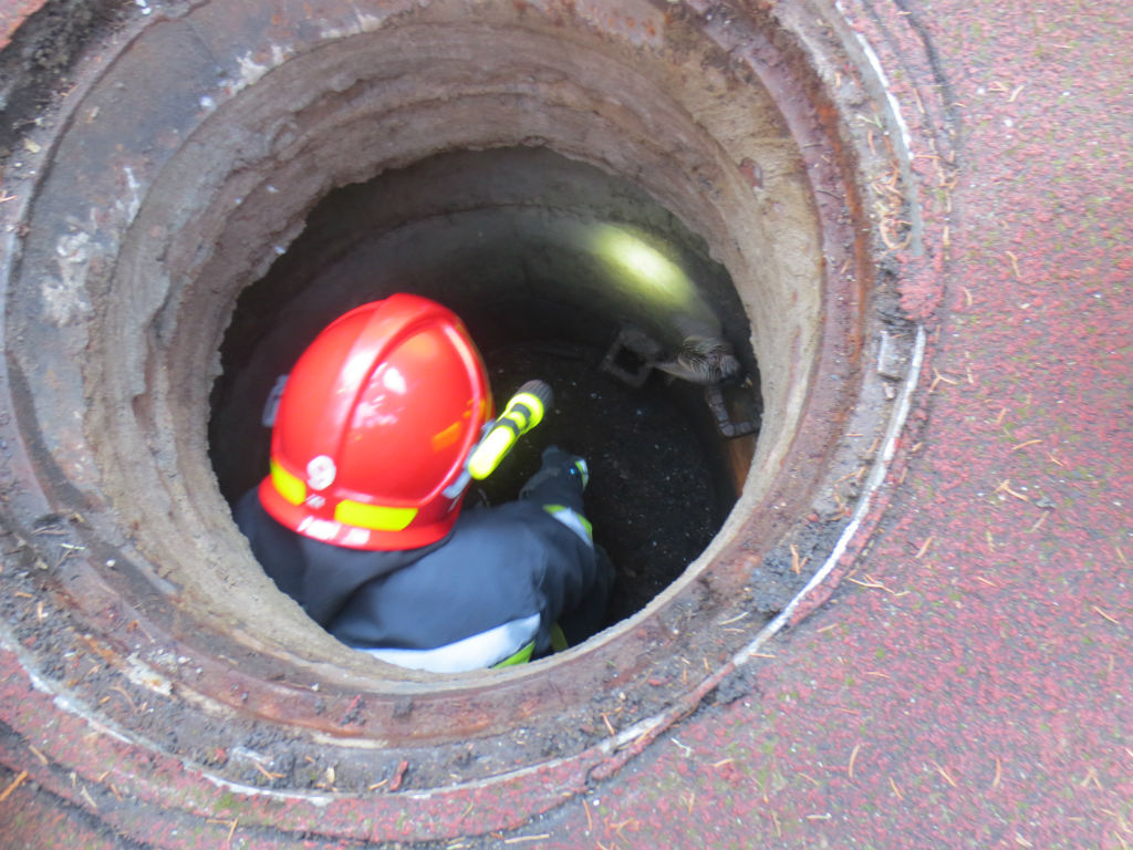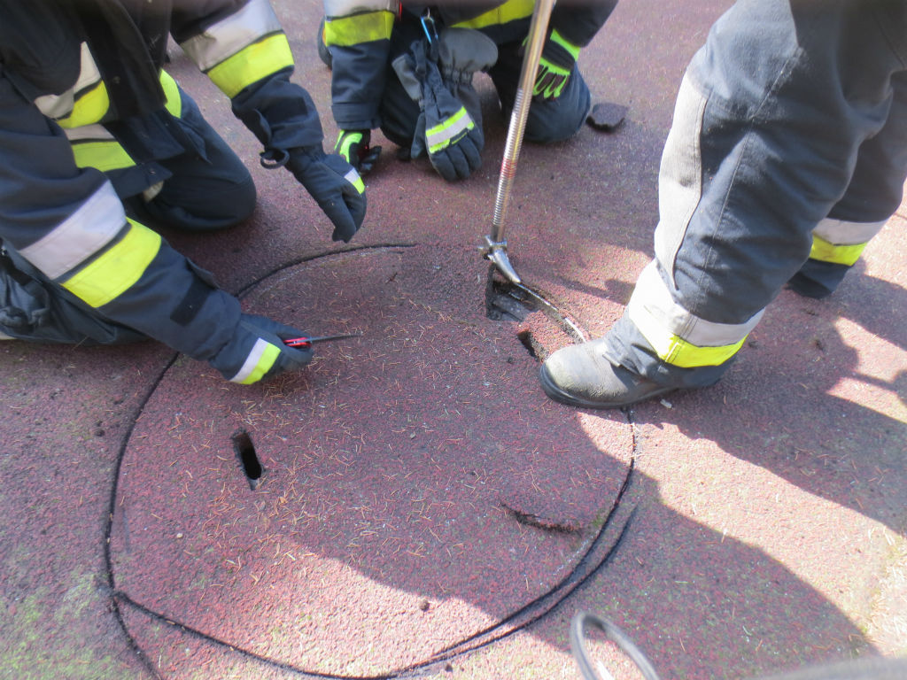Działania ratowników polegały w pierwszej fazie na zabezpieczeniu miejsca zdarzenia oraz zdarciu fragmentu tartanu, pod którym znajdował się właz do kanału. Następnie, korzystając z podręcznego sprzętu burzącego podniesiono właz i uwolniono zwierzę, które bez problemów odleciało.