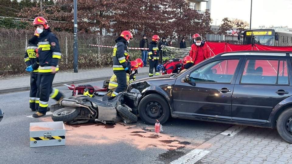 Na ulicy Skarbka z Gór na wysokości ulicy Astrowej na Białołęce doszło do zderzenia dostawcy pizzy na skuterze z samochodem osobowym marki Volkswagen. Ranny mężczyzna trafił do szpitala Lotniczym Pogotowiem Ratunkowym. Ulica zablokowana jest w obu kierunkach. Na miejscu pracują wszystkie służby.