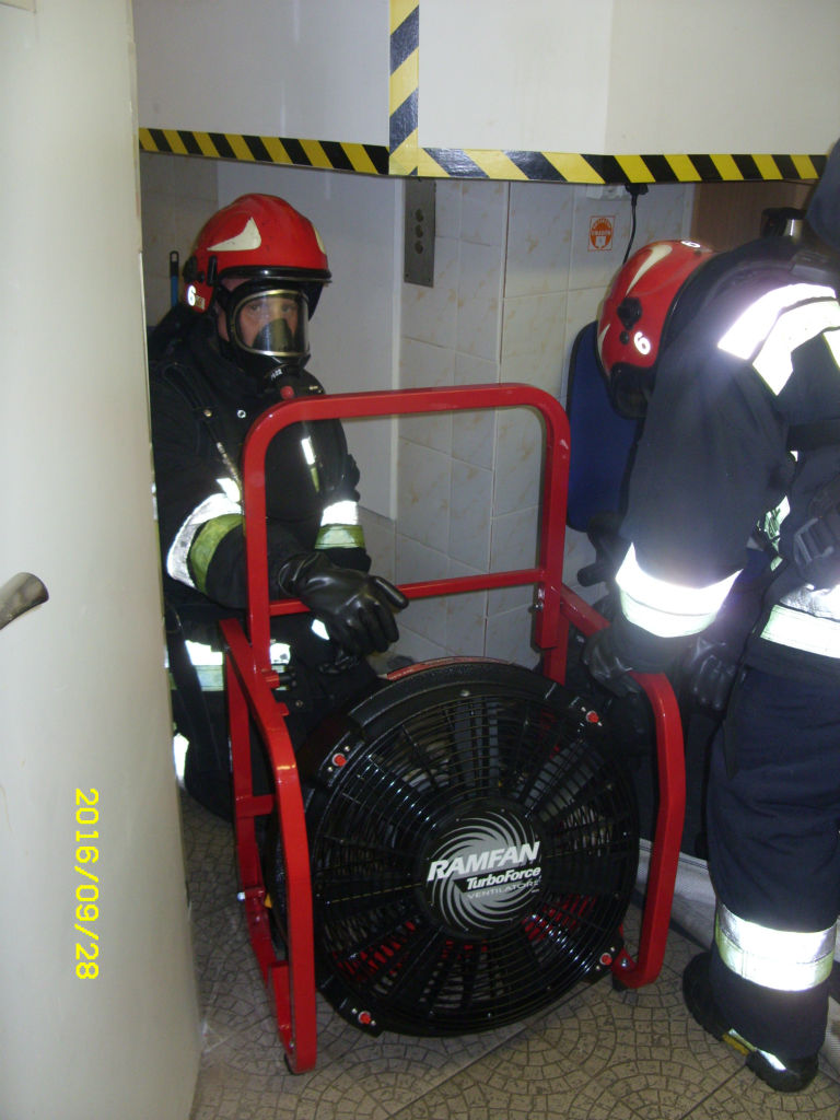 Kolejne działania strażaków polegały na dokładnym zabezpieczeniu nieszczelnej chłodziarki, wyniesieniu jej na zewnątrz budynku w wyznaczoną strefę oraz przewietrzeniu obiektu przy pomocy agregatu oddymiającego napędzanego wodą.