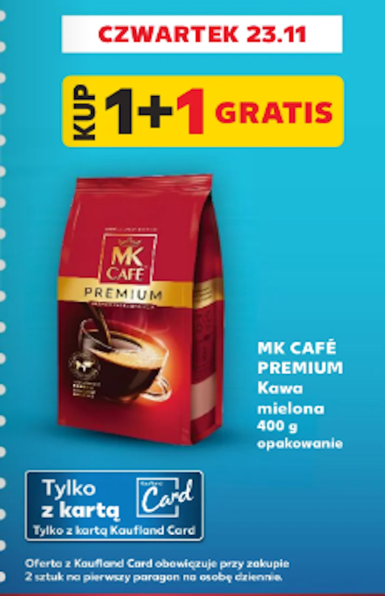 Kaufland, jedna z wiodących sieci supermarketów, ogłasza specjalną promocję dla miłośników kawy. W czwartek, 23 listopada, klienci posiadający kartę Kaufland Card będą mogli skorzystać z oferty 1+1 gratis na kawę MK Cafe Premium, kawa mielona, 400 g.