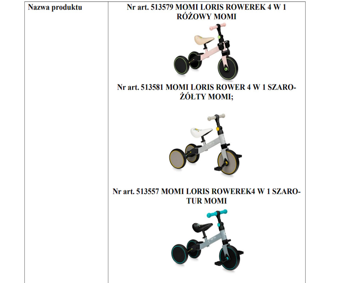 Chodzi konkretnie o trzy modele rowerków 4w1 Momi Loris, dostępne w różnych wariantach kolorystycznych – różowym (nr art. 513579), szarożółtym (nr art. 513581) i szaroturkusowym (nr art. 513557). Wadliwe są wszystkie partie tych produktów, niezależnie od daty zakupu.
