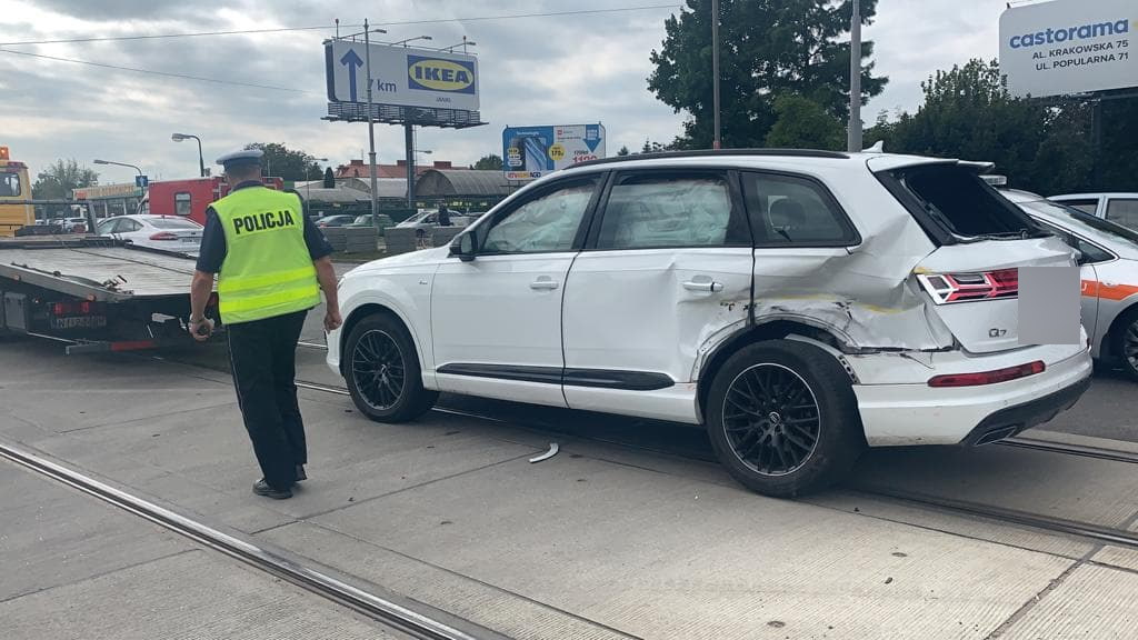 Audi wjechało pod tramwaj. Pogotowie i policja na miejscu. Ruch wstrzymany