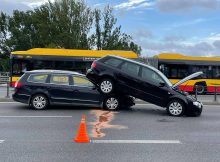 Na moście Łazienkowskim na wysokości Wału Miedzeszyńskiego w kierunku centrum doszło do zderzenia dwóch samochodów osobowych marki volkswagen i audi. Jedno z aut zawisło po zderzeniu na drugim.