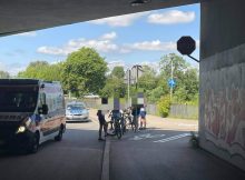 Na ulicy Farysa na Bielanach pod mostem Północnym na skrzyżowaniu ścieżek rowerowych doszło do zderzenia rowerzystów. 11-latka na rowerze zderzyła się z innym rowerzystą. Jedna osoba była badana
