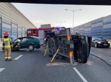 Na trasie S8 na wysokości Marymonckiej w kierunku Marek kierujący saabem wioząc na lawecie inny pojazd stracił panowanie nad autem. Przyczepka z autem wylądowała na boku. Nikomu nic