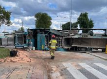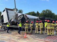 W miejscowości Dębe (pow. legionowski) na rondzie kierujący ciężarówką nie zabezpieczył odpowiednio ładunku doprowadzając do wywrócenia transportowanej maszyny. 36 tonowa frezarka wylądowała na boku. Nikomu nic się nie