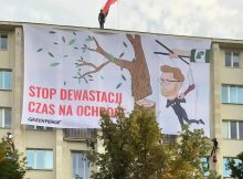 Kilka demonstrujących osób weszło wczoraj na dach Ministerstwa Środowiska i rozwiesili transparent „Stop dewastacji czas na ochronę”. Na transparencie widać podobiznę Ministra Michała Wosia, który ścina drzewo. W