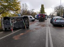 Na ulicy Odlewniczej doszło do zderzenia do zderzenia 3 samochodów osobowych i busa. Po zderzeniu mercedes wylądował na boku. Jedna osoba z mercedesa została ranna i trafiła do