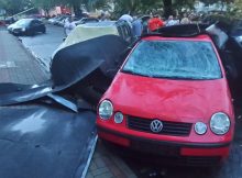 Przy ulicy Elbląskiej podczas burzy wiatr z bloku zerwał dach, który spadł na zaparkowane samochody. Strażacy zabezpieczali dach folią. Łukasz Kowalski