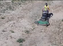 Jeden z pracowników kosi trawę na jednym z warszawskich podwórek. Nic w tym dziwnego gdyby nie to, że jest tam więcej piasku niż trawy. Słońce wypaliło większą część