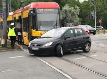 Peugeot z urwanym kołem blokuje torowisko na rondzie Waszyngtona. Na miejscu pracuje straż pożarna i służby Tramwajów Warszawskich. Łukasz Kowalski