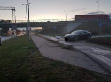 Na ulicy Głębockiej kierowca Maserati nie wyrobił się na zakręcie wpadł w poślizg i skosił znak i wylądował na chodniku. Łukasz Kowalski