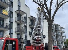Na ulicy Budki Szczęśliwickie na Ochocie strażacy działają przy wycince starej topoli, która grozi przewróceniem na drogę. Najpierw na specjalnych wózkach usunięto spod uszkodzonego drzewa dwa samochody. Przestawiono