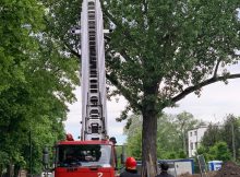 Na ulicy Chrościckiego we Włochach podczas prac ziemnych naruszony został system korzeniowy drzewa, które niebezpiecznie pochyliło się nad drogę. Strażacy podjęli decyzję o wycince topoli. Zablokowana została ulica