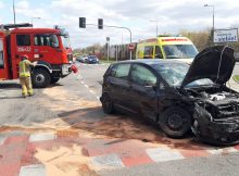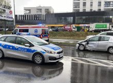 Na skrzyżowaniu Maczka z Rudnickiego na Bielanach doszło do zderzenia dwóch samochodów osobowych marki Jeep i volkswagen. Po zderzeniu jeep wjechał w betonowy kosz na śmieci. Jedna osoba