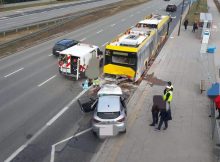 W al. Jerozolimskich na wysokości ulicy Śmigłowca w kierunku centrum bus z pasażerami marki renault wjechał tył elektrycznego samochodu marki Tesla. Jedna osoba z samochodu osobowego była badana