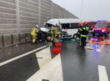 Na trasie S2 na wysokości ulicy Wrzosowej (Piastów) w kierunku Okęcia doszło do zderzenia busa z ciężarówką. Kierujący busem jest zakleszczony, aktualnie strażacy używają sprzętu hydraulicznego, aby wydobyć