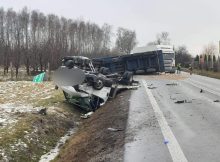 W miejscowości Bikówek na drodze krajowej numer 50 doszło do zderzenia ciężarówki z lawetą. Po zderzeniu ciężarówka wywróciła się na bok, laweta wpadła do rowu na dach. Osoba
