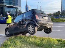 Na Rondzie Daszyńskiego doszło do zderzenia dwóch samochodów osobowych marki BMW i mini. Po zderzeniu mini zawisło na słupie. Nikomu nic się nie stało. Łukasz Kowalski