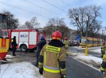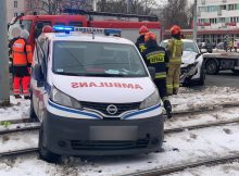 Karetka prywatna marki opel zderzyła się z samochodem osobowym marki mazda. Pojazdy zablokowały torowisko w obu kierunkach, po tym jak wpadła na nie karetka. Na miejscu pracują strażacy,
