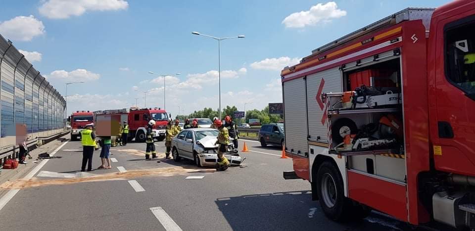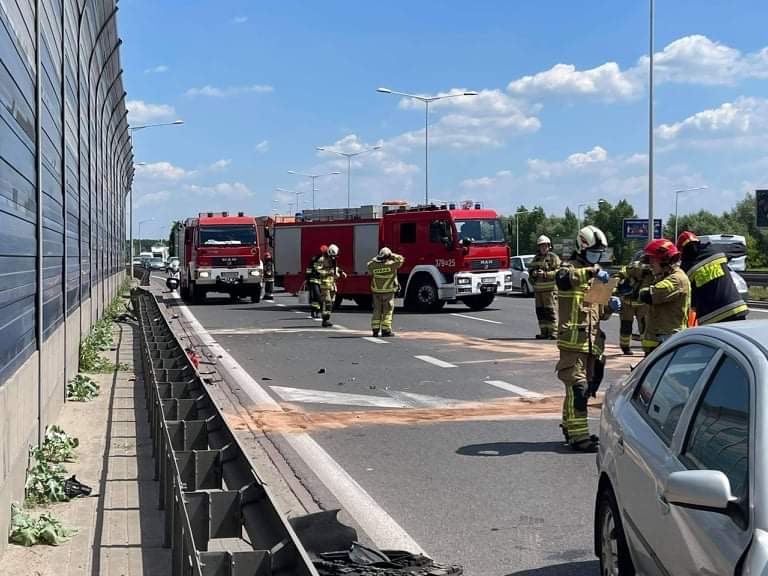 Na miejscu pracują trzy zastępy straży pożarnej oraz policja. Części auta leżały na kilku pasach.