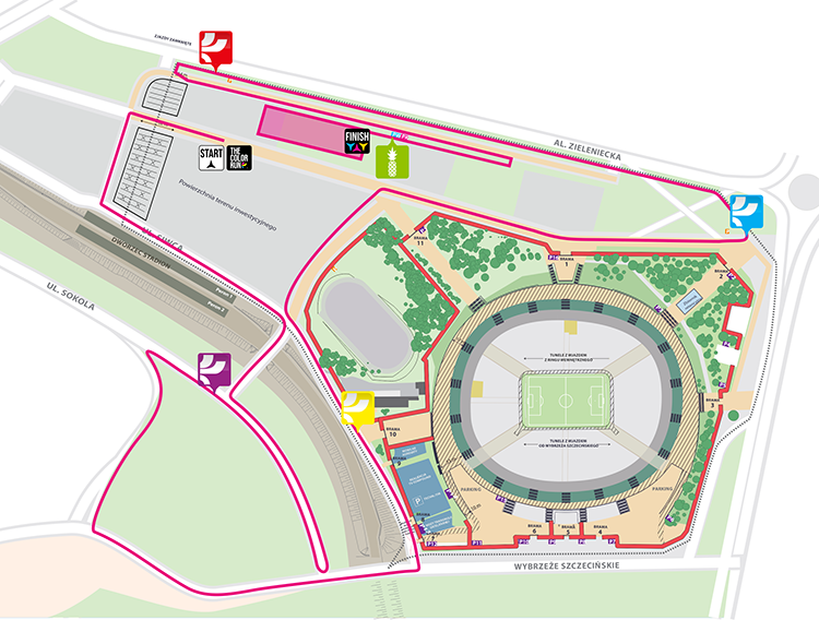 Festiwal „The Color Run” rozpoczął się o godz. 12.30 na błoniach PGE Narodowego. Biegacze wystartowali o godz. 14.00 i przebiegną na trasie prowadzącej ulicami: R. Siwca, Sokola, Zamoście, Wybrzeże Szczecińskie (jeden pas), błonia PGE Narodowego, al. Zieleniecka. Zakończenie imprezy planuje się na godz. 18.00.