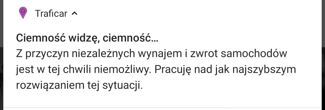 Jak informuje serwis Traficar „Z przyczyn niezależnych wynajem i zwrot samochodów jest w tej chwili niemożliwy. Pracuję nad jak najszybszym rozwiązaniem„