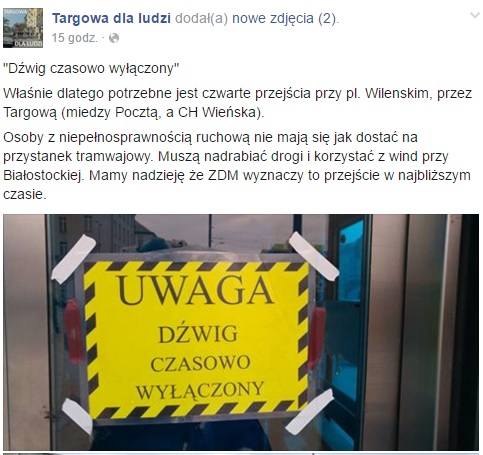 Niepełnosprawni mają kłopoty przy pokonywaniu barier architektonicznych przy Dworcu Wileńskim. Nie działa tam winda, co znacznie wydłuża i utrudnia podróż osobom niepełnosprawnym. O sprawie poinformował fanpage Targowa dla ludzi