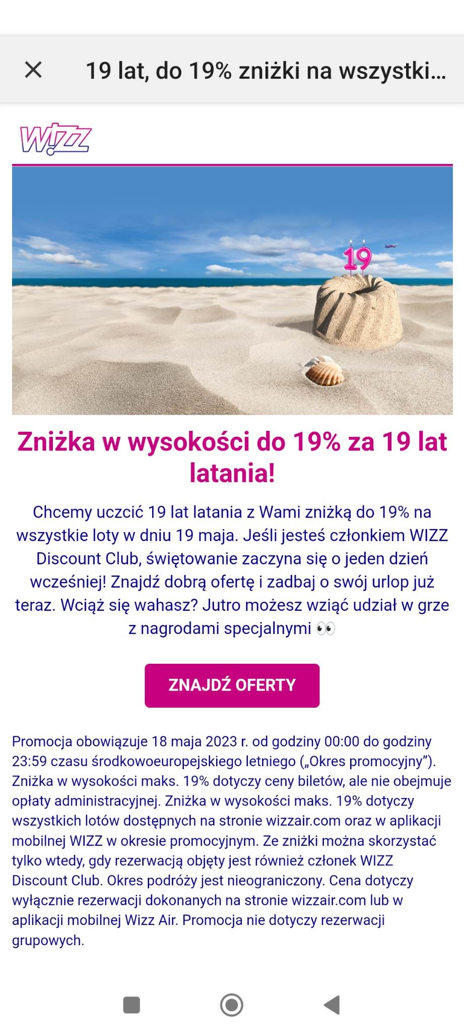 Chcemy uczcić 19 lat latania z Wami zniżką do 19% na wszystkie loty w dniu 19 maja. Jeśli jesteś członkiem WIZZ Doscount Club. świętowanie zaczyna się o jeden dzień wcześniej!” – czytamy.