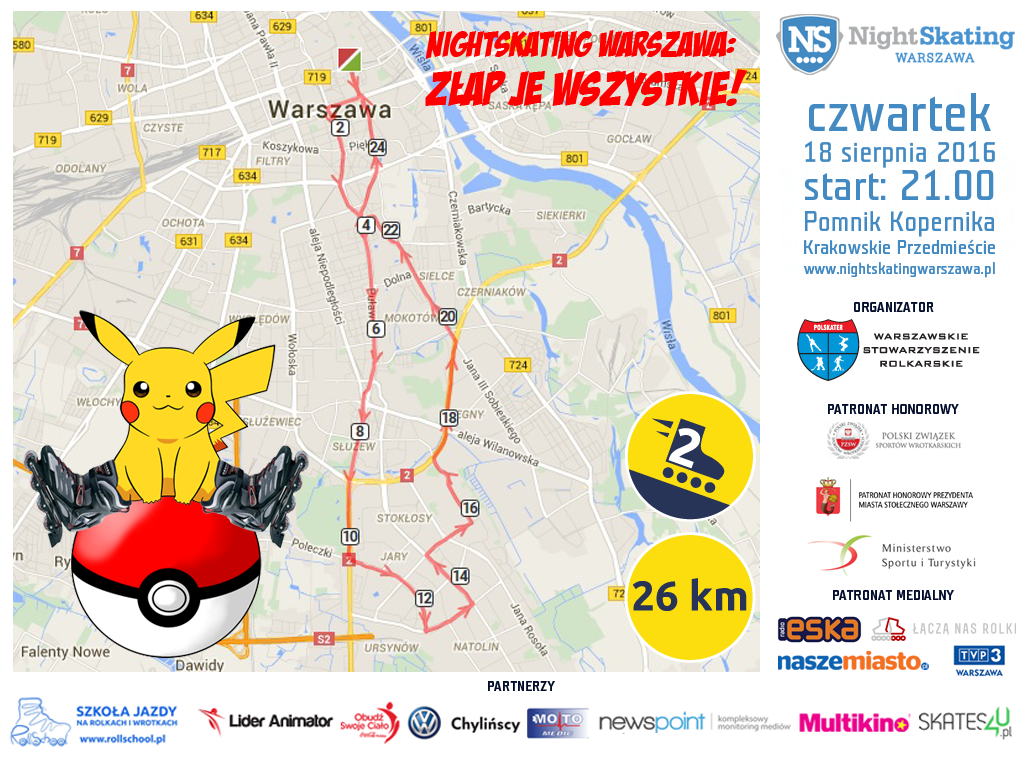 „Pokémon to nieodłączny element dzieciństwa większości z naszych uczestników. Obecnie powrócił w wydaniu gry geolokalizacyjnej i szturmem podbija serca użytkowników na całym świecie, zachęcając ich do wyjścia z domu. Zainspirowani ostatnim trendem oraz Waszymi prośbami, wychodzimy temu na przeciw i organizujemy pierwszy w historii Nightskating Warszawa w klimacie Pokemon! Mile widziane stroje tematyczne” – zapowiadają organizatorzy przejazdu.